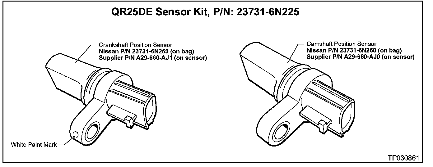 ^ The Crankshaft and Camshaft Position Sensors in Sensor Kit P/N 23731-6N225 look the same. To help you tell the difference between these sensors, a white paint mark was added to the Crankshaft sensor (see illustration above).