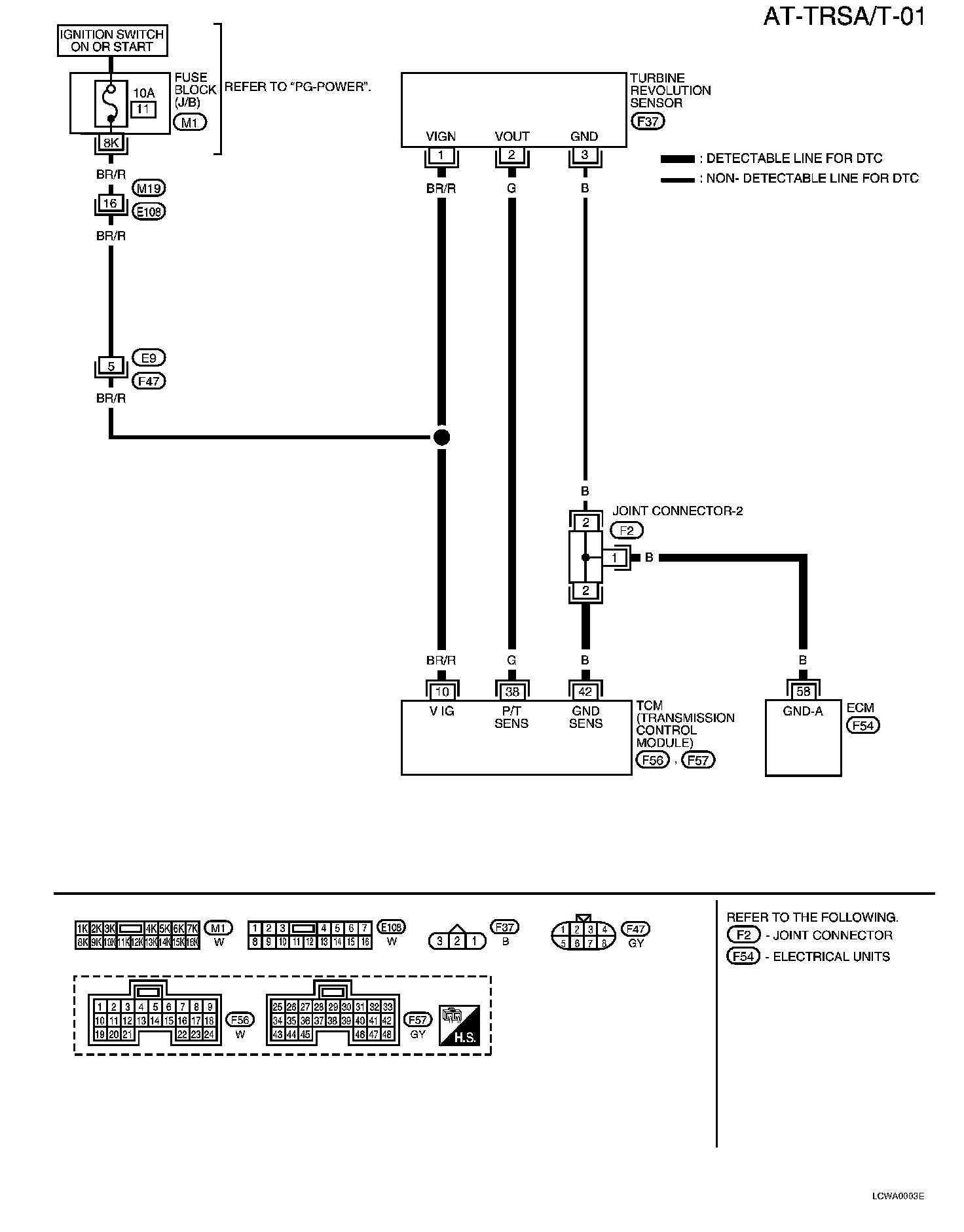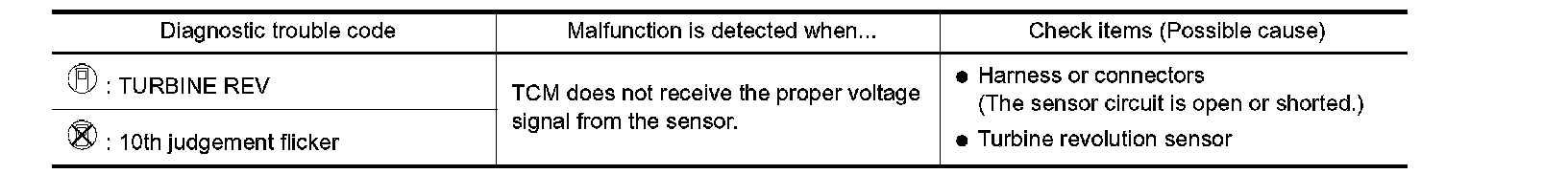 Check harness for short or open between TCM and turbine revolution sensor.
