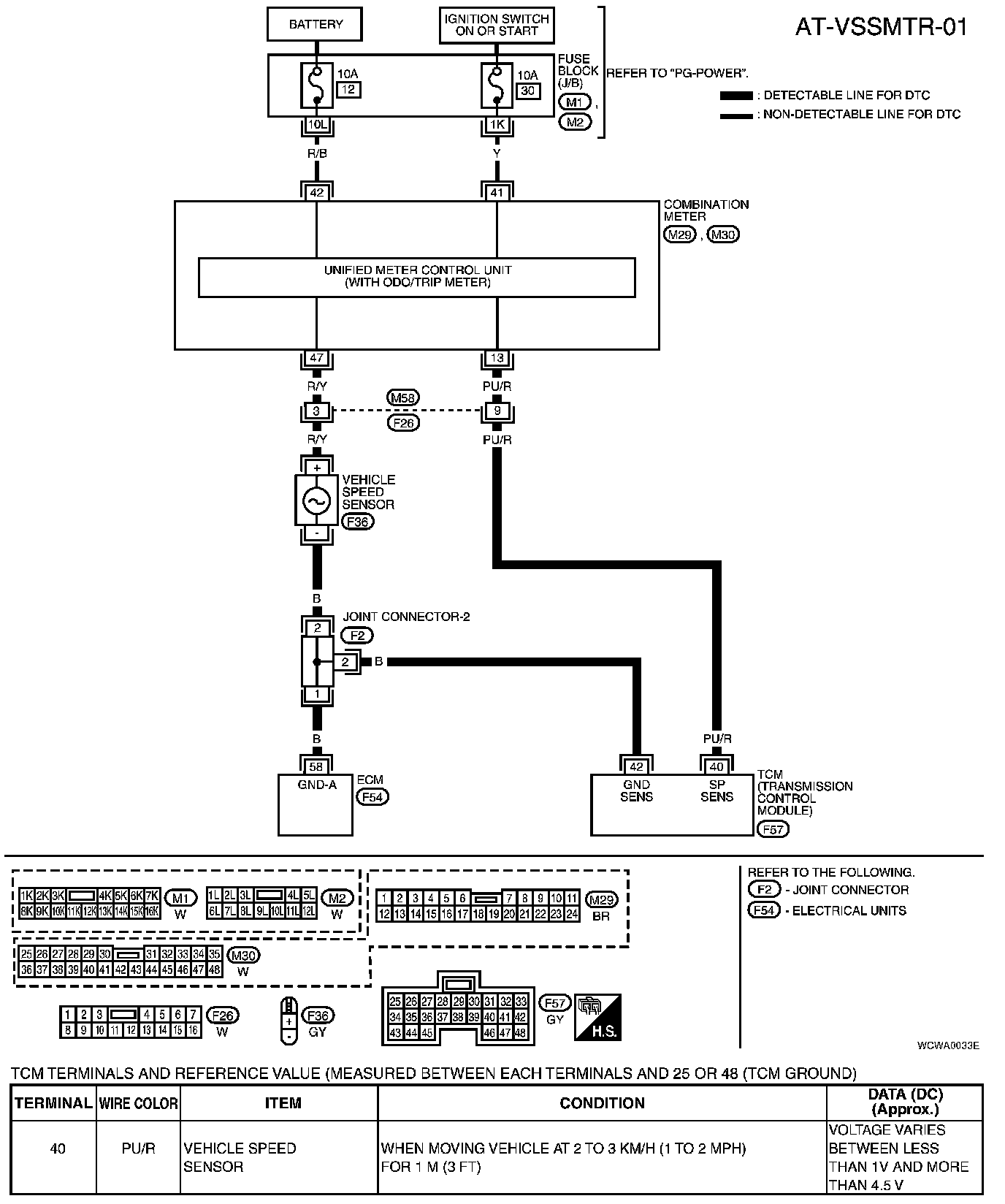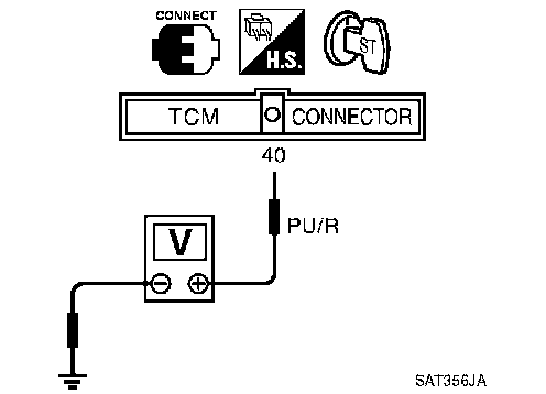 2. Check voltage between TCM terminal 40 and ground while driving at 2 to 3 km/h (1 to 2 MPH) for 1 m (3 ft)or more.