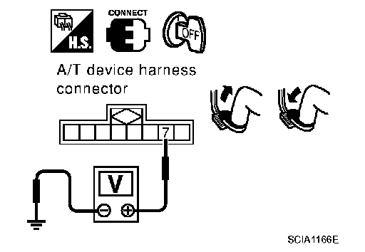 ^ Check voltage between A/T device harness connector M44 terminal 7 (G) and ground.