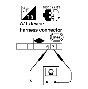 Check continuity between A/T device harness connector M44 terminals 6 (B) and 7 (G).