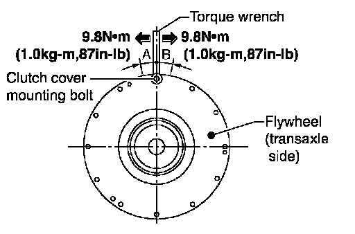 1. Install a bolt to clutch cover mounting hole, and place a torque wrench on the extended line of the flywheel center line.