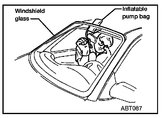 After removing interior moldings and trim to access edge of glass, remove glass using piano wire or power cutting tool and an inflatable pump bag.