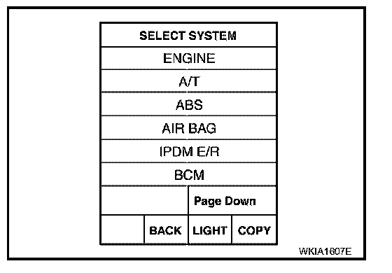 - If "IPDM E/R" is not displayed, print "SELECT SYSTEM" screen, then refer to "Precautions For Trouble Diagnosis".