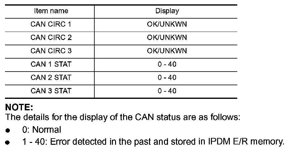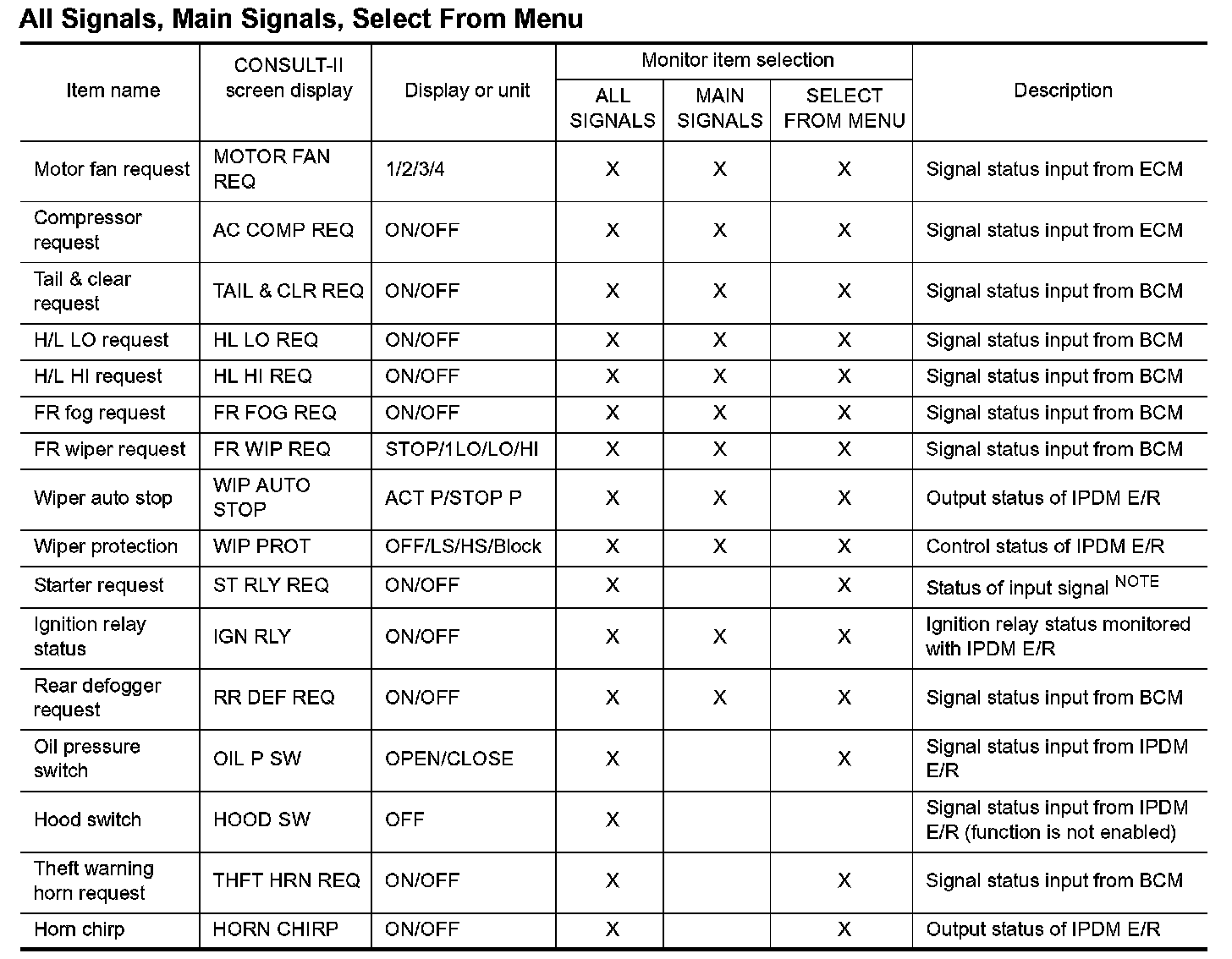 NOTE: Perform monitoring of IPDM E/R data with the ignition switch ON. When the ignition switch is in ACC position, display may not be correct.