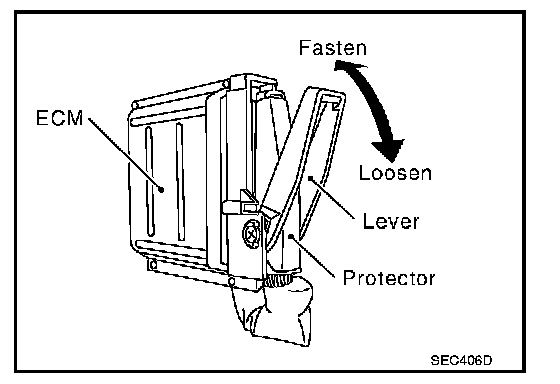 3. When disconnecting ECM harness connector, loosen it with lever as far as it will go as shown at right.