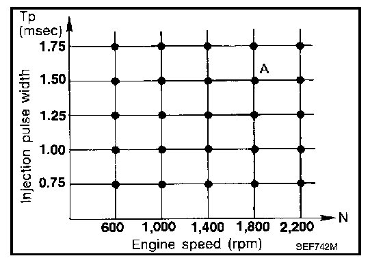 The ignition timing is controlled by the ECM to maintain the best air fuel ratio for every running condition of the engine. The ignition timing data is stored in the ECM. This data forms the map shown.