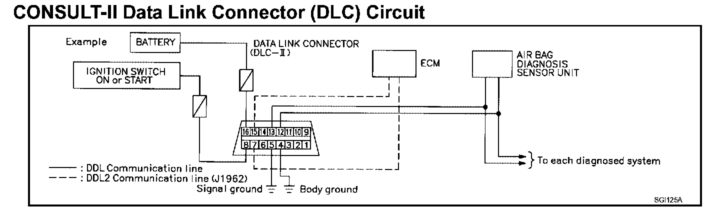 NOTE: The DDL1 and DDL2 circuits from DLC pins 12, 13, 14 and 15 may be connected to more than one system. A short in a DDL circuit connected to a control unit in one system may affect CONSULT-II access to other systems.