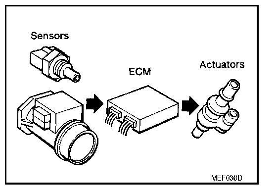 The engine has an ECM to control major systems such as fuel control, ignition control, idle air control system, etc. The ECM accepts input signals from sensors and instantly drives actuators. It is essential that both input and output signals are proper and stable. At the same time, it is important that there are no malfunctions such as vacuum leaks, fouled spark plugs, or other malfunctions with the engine.