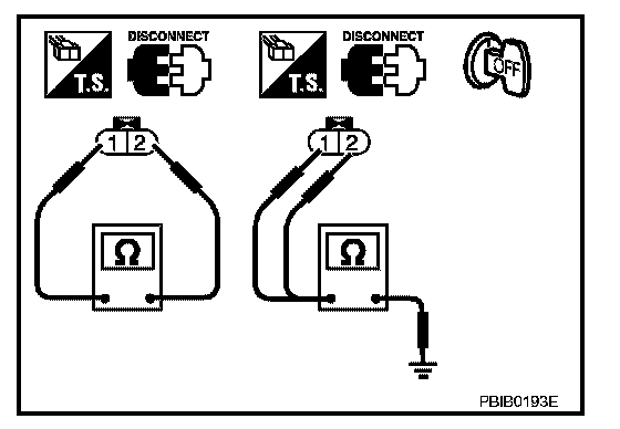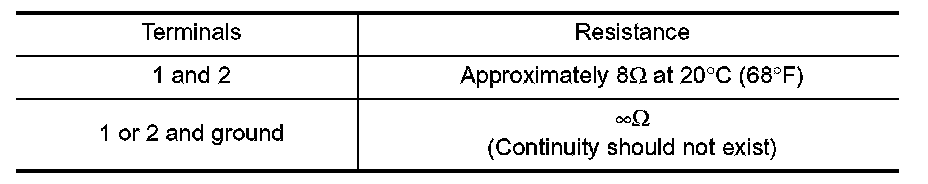 2. Check resistance between intake valve timing control solenoid valve terminals 1 and 2 under the following conditions.