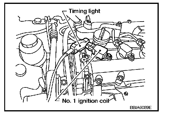 2. Connect No. 1 ignition coil and No. 1 spark plug with suitable high-tension wire as shown, and attach timing light clamp to this wire.