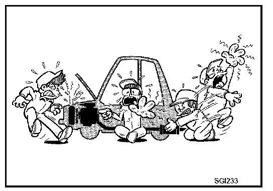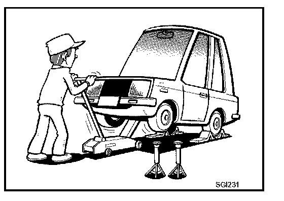 - Before jacking up the vehicle, apply wheel chocks or other tire blocks to the wheels to prevent the vehicle from moving. After jacking up the vehicle, support the vehicle weight with safety stands at the points designated for proper lifting before working on the vehicle.
