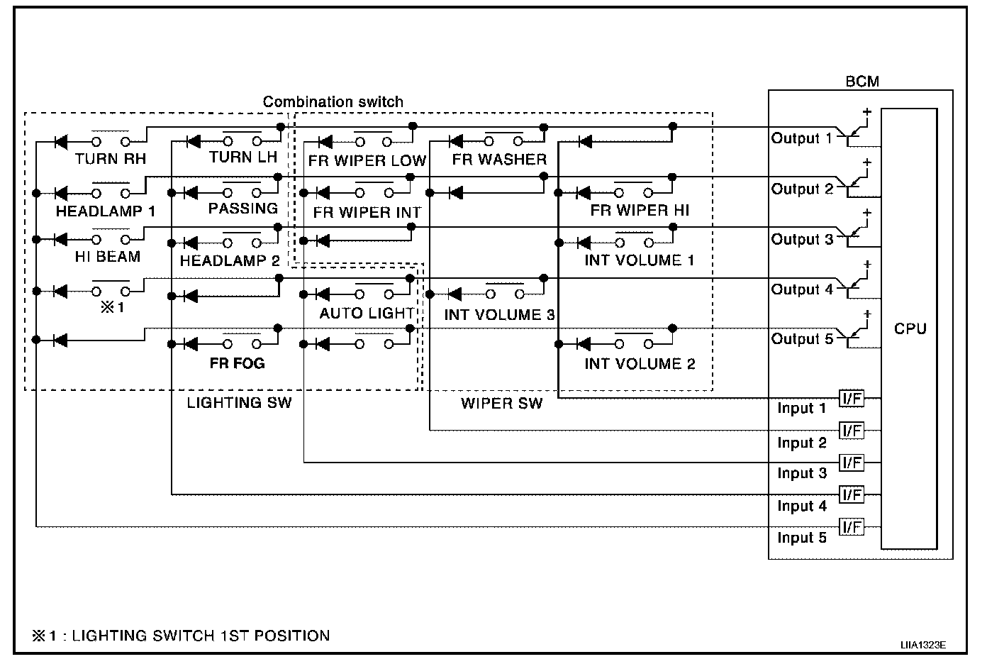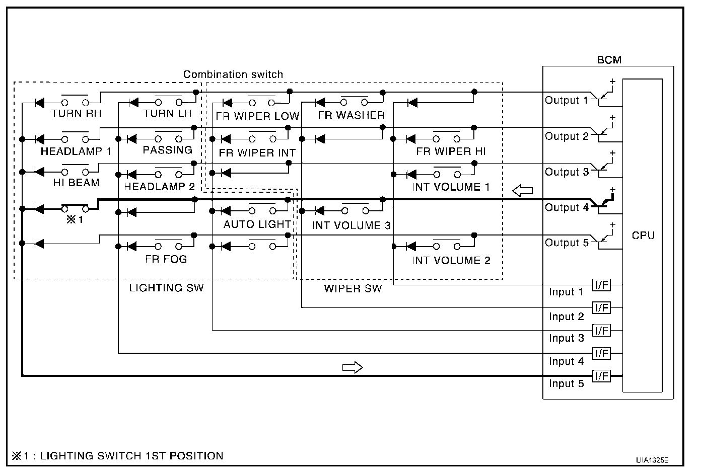 - When lighting switch 1st position is turned ON, contact in combination switch turns ON. At this time if OUTPUT 4 transistor is activated, BCM detects that voltage changes in INPUT 5.