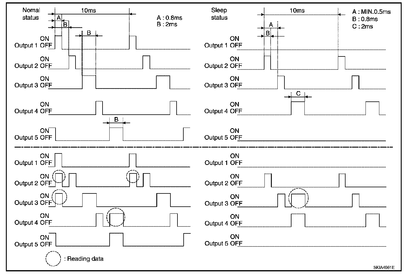 - When BCM is in sleep mode, transistors of OUTPUT 1 and 5 stop the output, and BCM enters low-current-consumption mode. OUTPUTS (2, 3, and 4) turn ON-OFF at 10 ms intervals, and receives lighting switch input only.