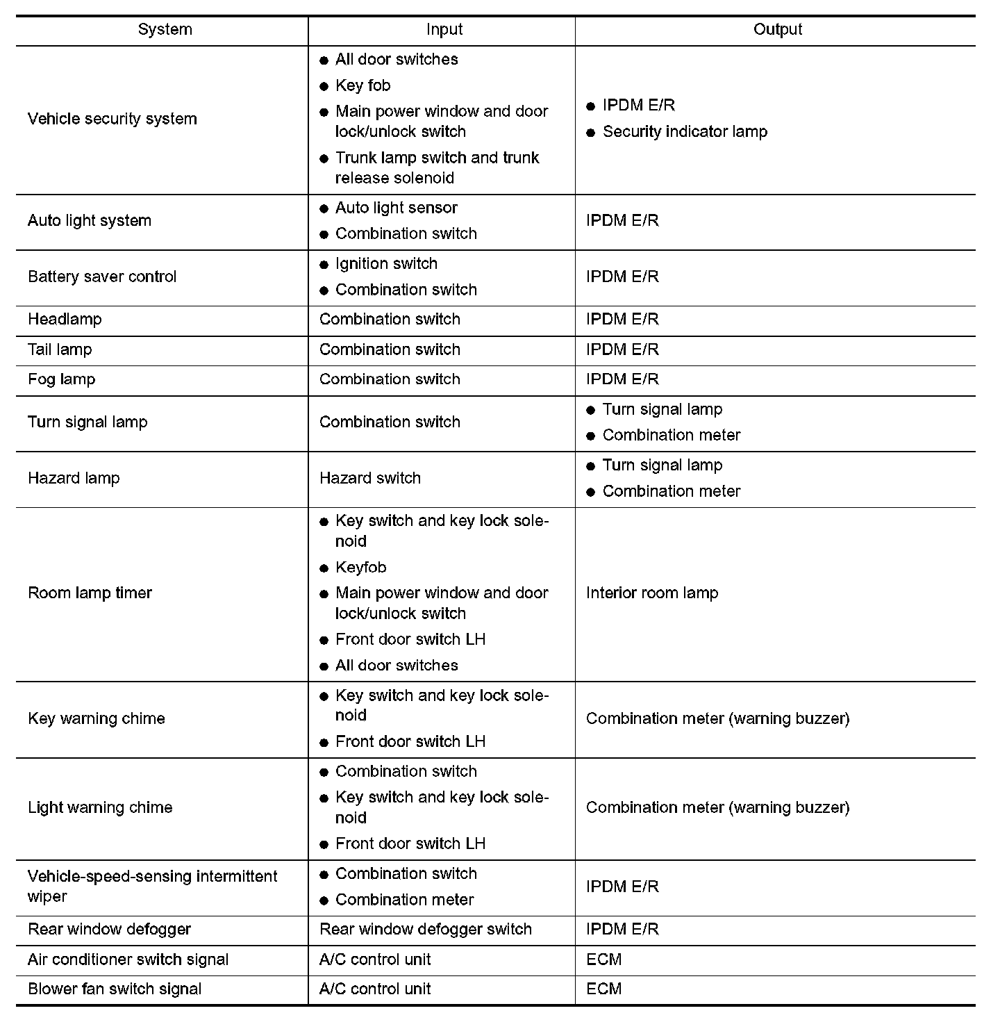 BCM has a combination switch reading function for reading the operation of combination switches (light, wiper washer, turn signal) in addition to the function for controlling the operation of various electrical components. Also, it functions as an interface that receives signals from the A/C control unit, and sends signals to ECM using CAN communication.