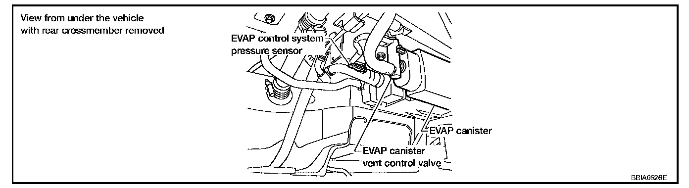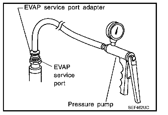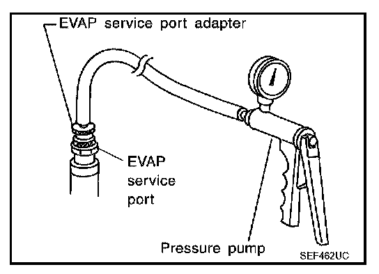 EVAP SERVICE PORTPositive pressure is delivered to the EVAP system through the EVAP service port. If fuel vapor leakage in the EVAP system occurs, use a leak detector to locate the leak.
