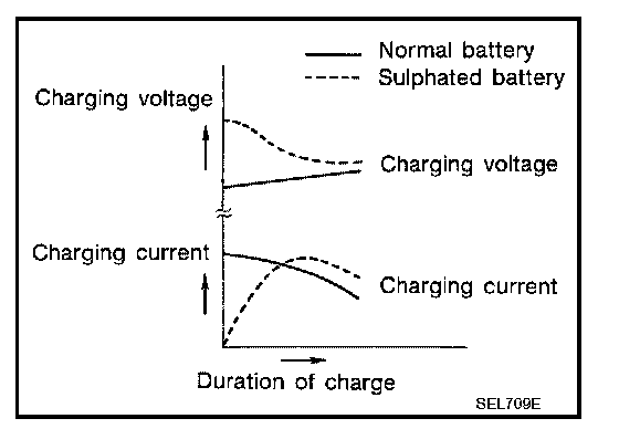 To determine if a battery has been "sulphated", note its voltage and current when charging it. As shown in the figure, less current and higher voltage are observed in the initial stage of charging sulphated batteries.