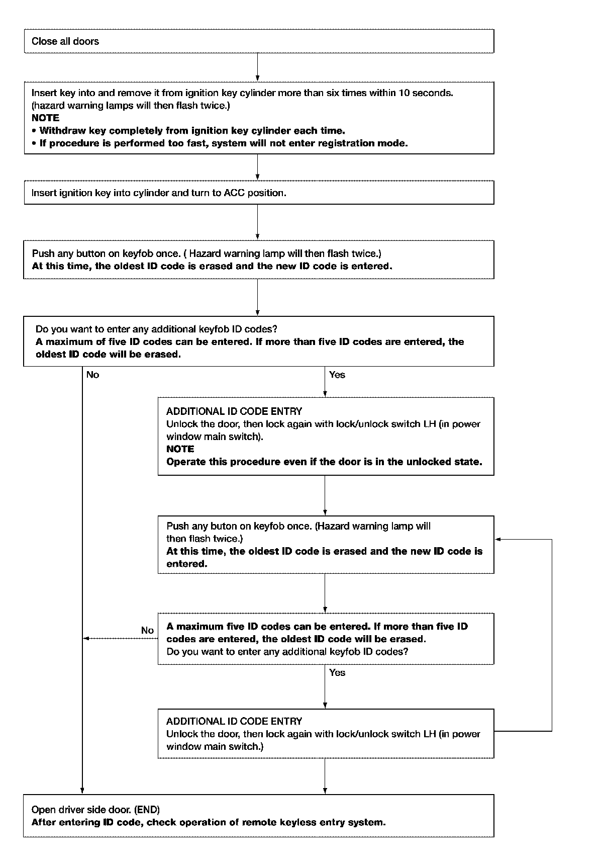 - When registering an additional keyfob, the existing ID codes in memory may or may not be erased. If five ID codes are stored in memory, when an additional code is registered, only the oldest code is erased. If less than five ID codes are stored in memory, when an additional ID code is registered, the new ID code is added and no ID codes are erased.