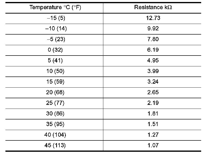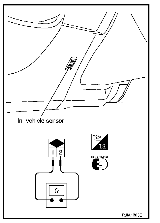 After disconnecting in-vehicle sensor connector, measure resistance between terminals 1 and 2 at sensor harness side, using the table.