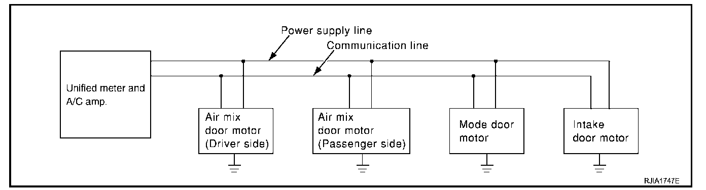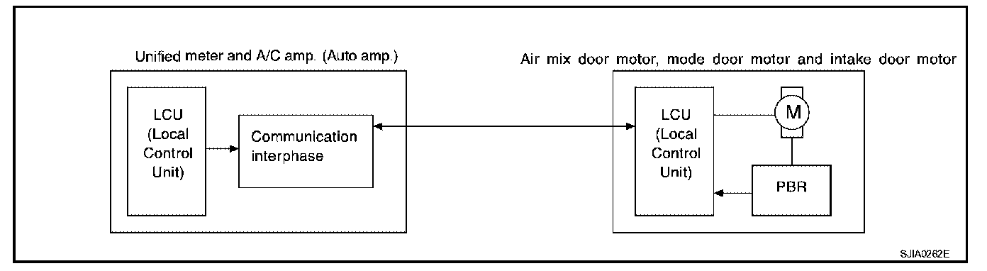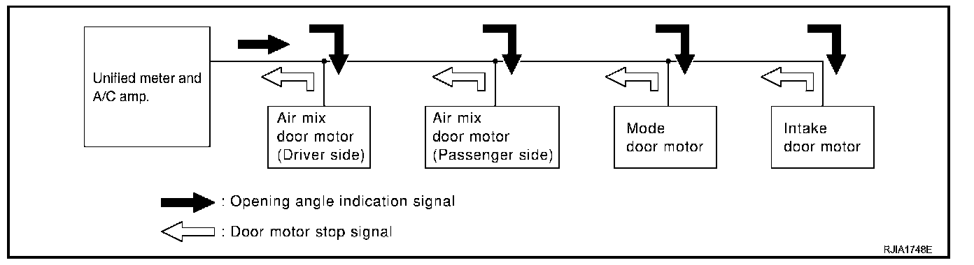 The mode door motor, air mix door motor and intake door motor read their respective signals according to the address signal. Opening angle indication signals are sent from the unified meter and A/C amp. to each of the motors and are compared by the LCUs in each motor with the existing position and opening angles. Subsequently, HOT/COLD, DEFROST/VENT or FRESH/RECIRCULATION operation is selected. When the selected angle position is reached a reply is sent form the motors back to the unified. meter and A/C amp.