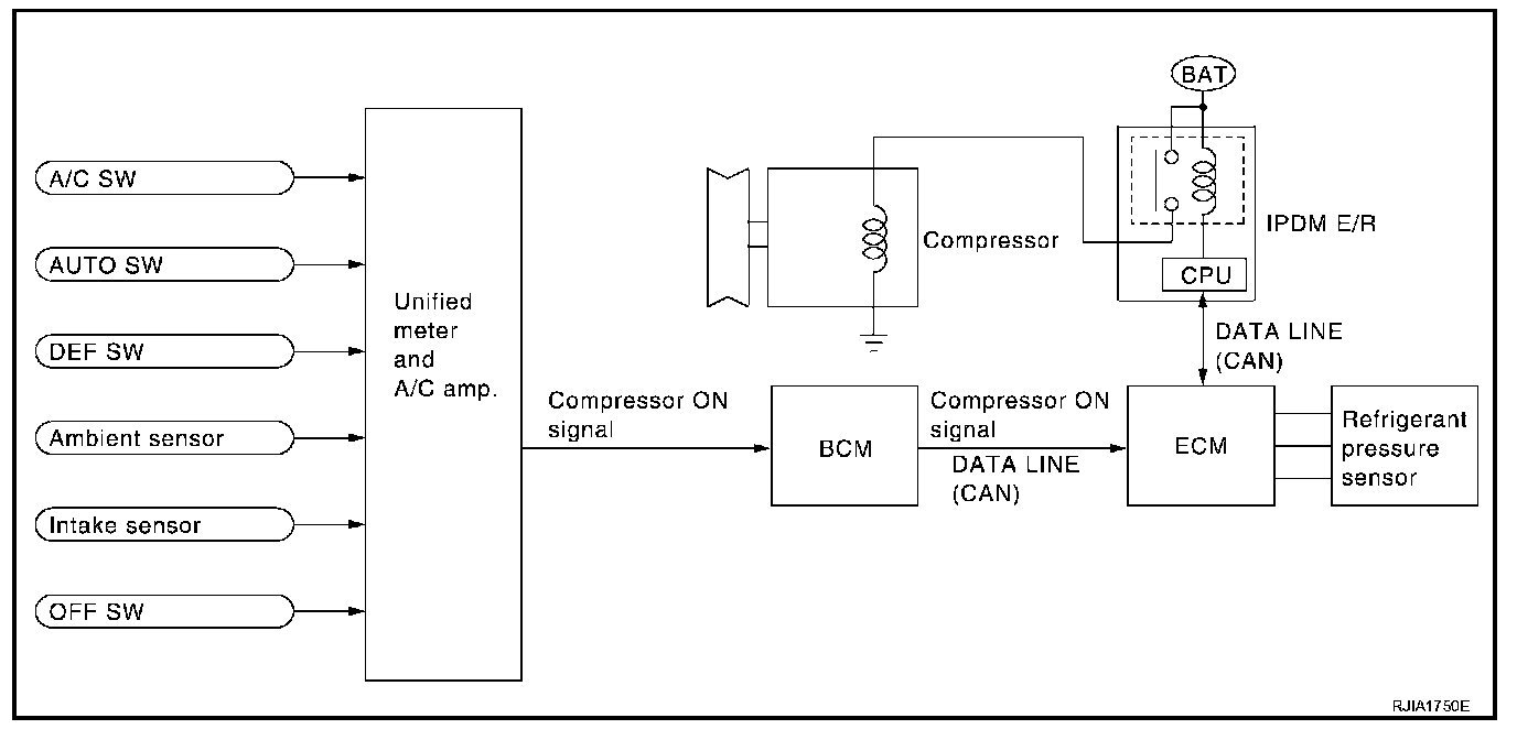 When A/C switch or DEF switch is pressed, unified meter and A/C amp. inputs compressor ON signal to BCM. BCM sends compressor ON signal to ECM, via CAN communication line.