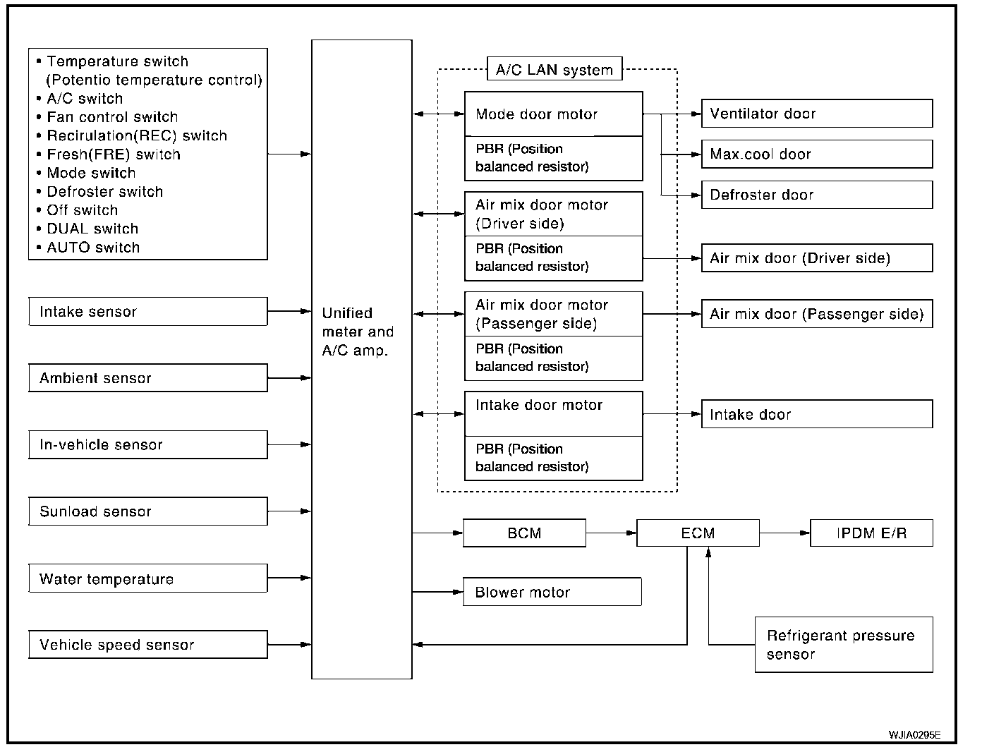 The LAN (Local Area Network) system consists of unified meter and A/C amp., mode door motor, air mix door motor and intake door motor.