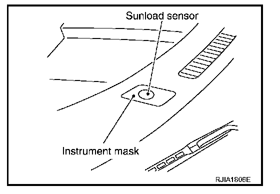 The sunload sensor is located on the passenger side defroster grille. It detects sunload entering through windshield by means of a photo diode. The sensor converts the sunload into a current value which is then input into the unified meter and A/C amp.