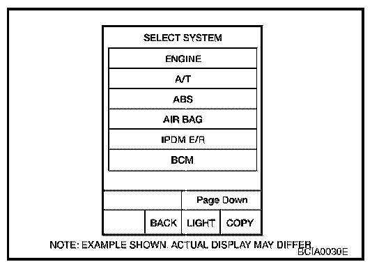 3. Touch "BCM" on "SELECT SYSTEM" screen. If "BCM" is not indicated, go to GI-36, "CONSULT-II Data Link Connector (DLC) Circuit". Data Link Connector Schematic