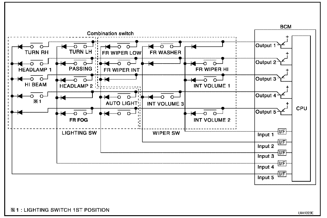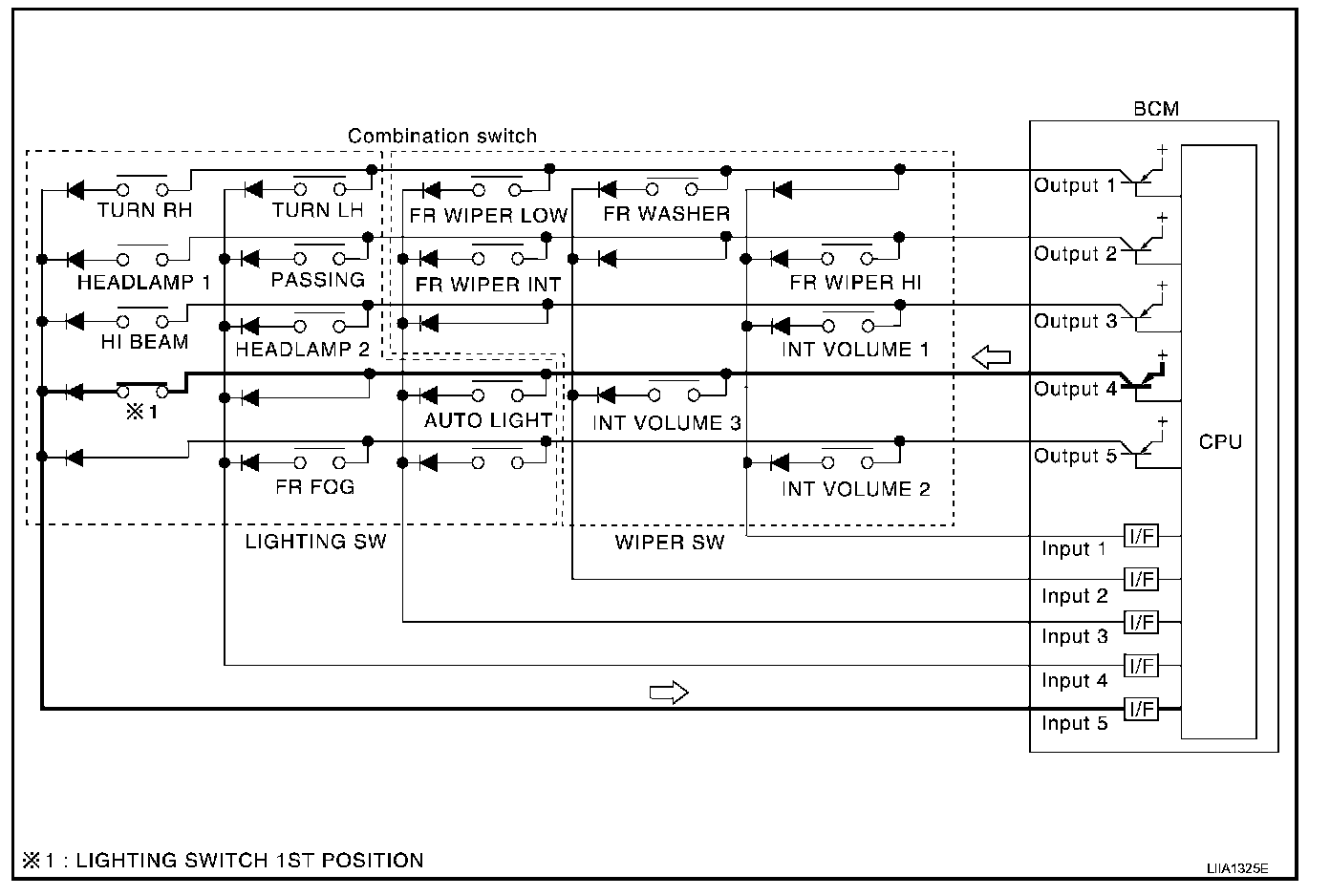 - When lighting switch 1st position is turned ON, contact in combination switch turns ON. At this time if OUTPUT 4 transistor is activated, BCM detects that voltage changes in INPUT 5.