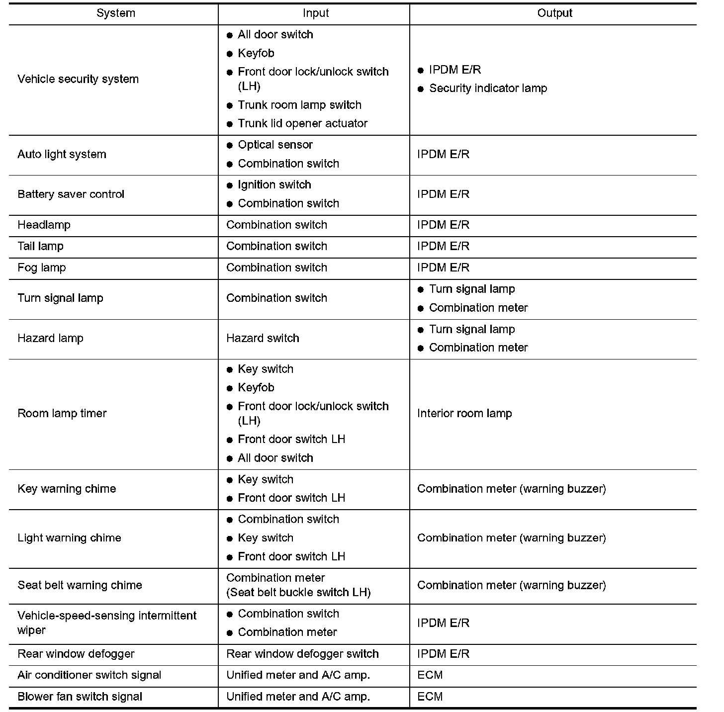 BCM has a combination switch reading function for reading the operation of combination switches (light, wiper washer, turn signal) in addition to the function for controlling the operation of various electrical components. Also, it functions as an interface that receives signals from the A/C control unit (with manual A/C), A/C auto amplifier (with auto A/C), and sends signals to ECM using CAN communication.
