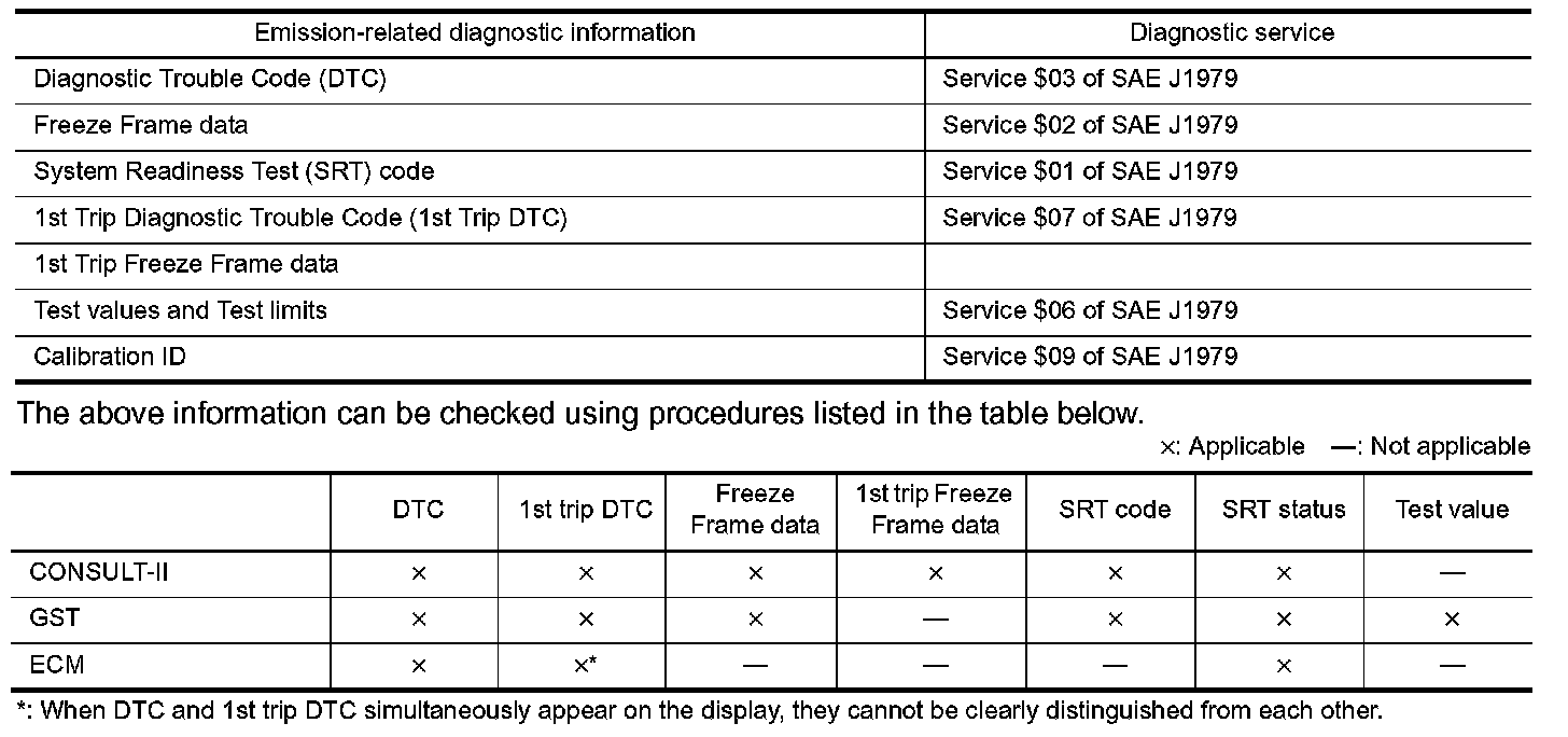 The ECM has an on board diagnostic system, which detects malfunctions related to engine sensors or actuators. The ECM also records various emission-related diagnostic information including the table.