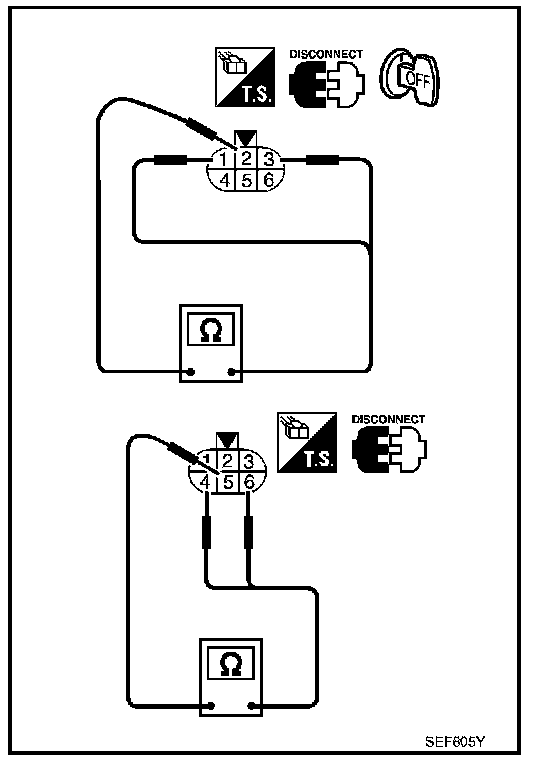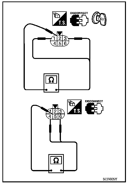 3. Check resistance between EGR volume control valve terminal 2 and terminals 1, 3, terminal 5 and terminals 4, 6.