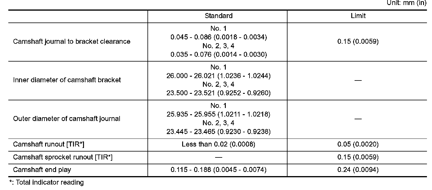 Camshaft runout [TIR*] Less than 0.02 (0.0008) 0.05 (0.0020)