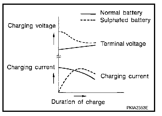 To determine if a battery has been "sulphated", note its voltage and current when charging it. As shown in the figure, less current and higher voltage are observed in the initial stage of charging sulphated batteries.