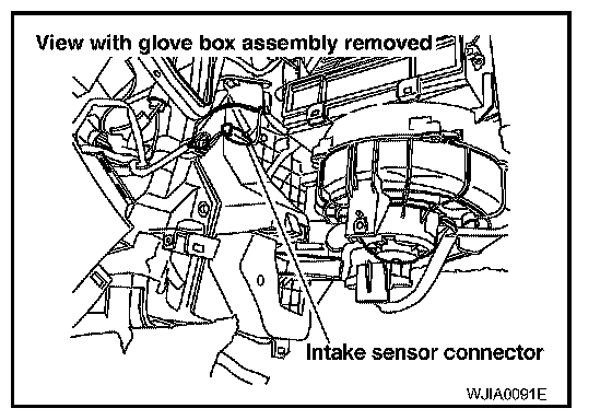 The intake sensor is located on the heater and cooling unit. It converts temperature of air after it passes through the evaporator into a resistance value which is then input to the air control.
