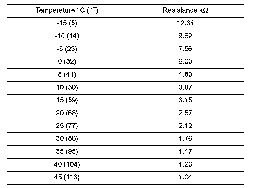 After disconnecting intake sensor harness connector, measure resistance between terminals 1 and 2 at sensor harness side, using the table.