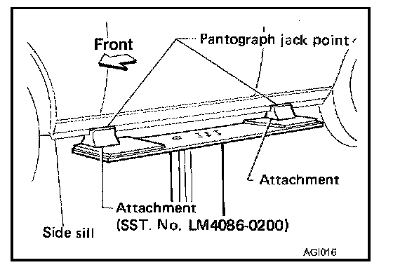 - The board-on lift attachment (LM4086-0200) set at front end of vehicle should be set on the front of the sill under the front door opening.