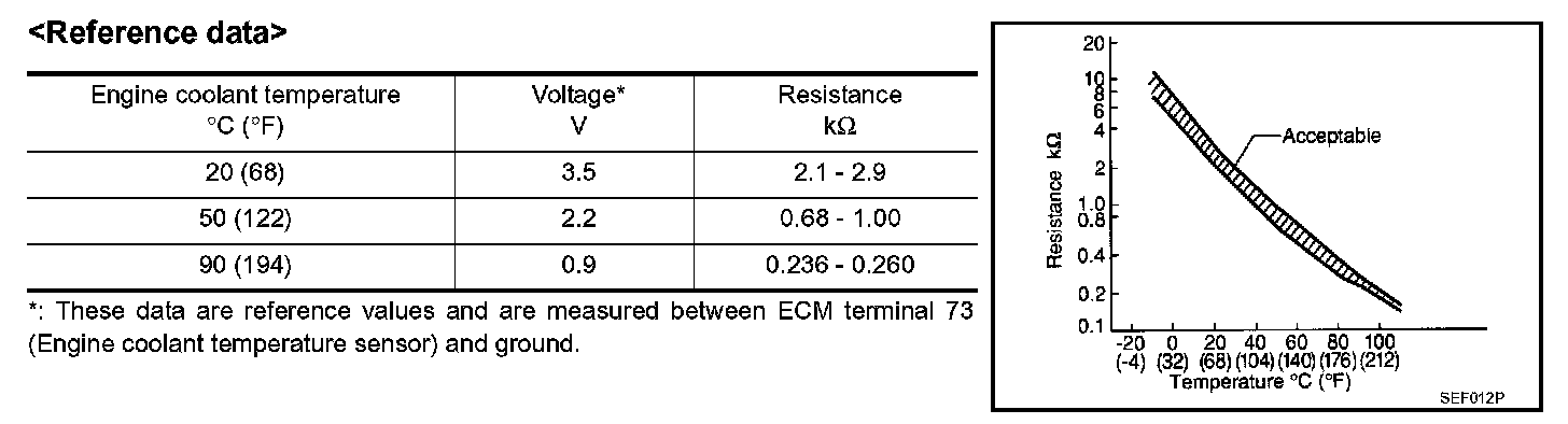 The engine coolant temperature sensor is used to detect the engine coolant temperature. The sensor modifies a voltage signal from the ECM. The modified signal returns to the ECM as the engine coolant temperature input. The sensor uses a thermistor which is sensitive to the change in temperature. The electrical resistance of the thermistor decreases as temperature increases.