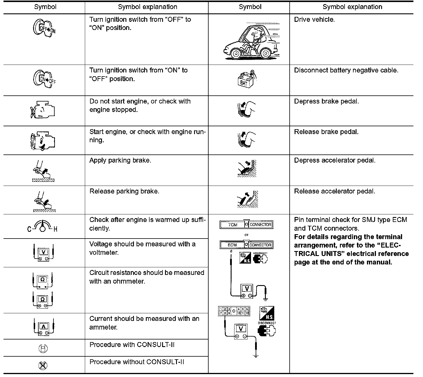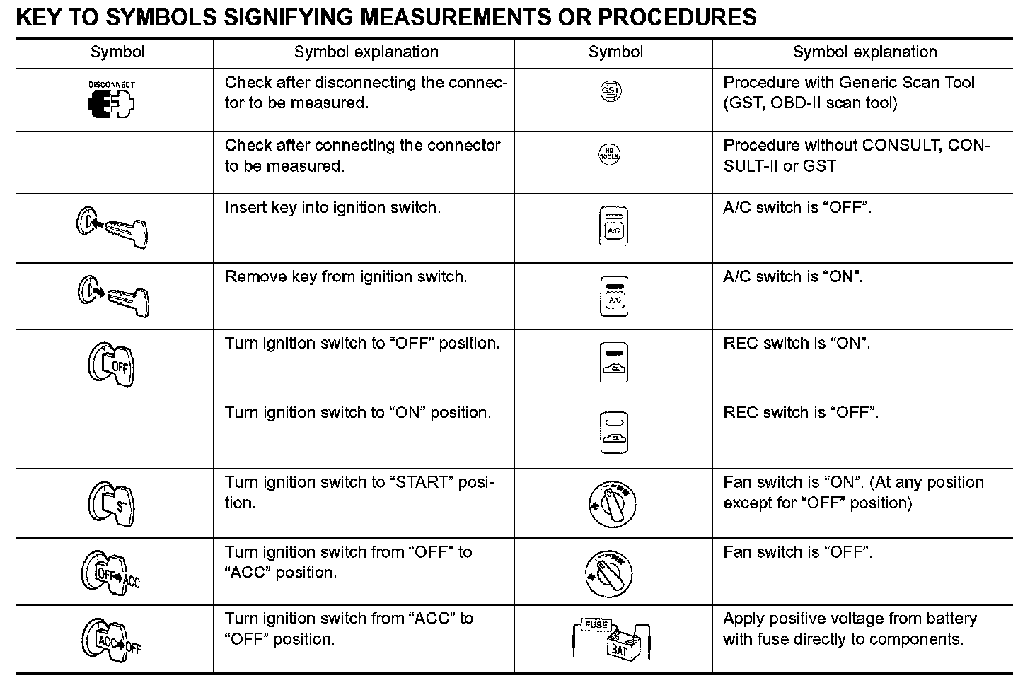 Symbols included in illustrations refer to measurements or procedures. Before diagnosing a problem, familiarize yourself with each symbol. Refer to "Connector Symbols" in General Information and "KEY TO SYMBOLS SIGNIFYING MEASUREMENTS OR PROCEDURES" below.