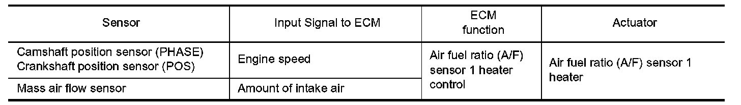 The ECM performs ON/OFF duty control of the A/F sensor 1 heater corresponding to the engine operating condition to keep the temperature of A/F sensor 1 element at the specified range.