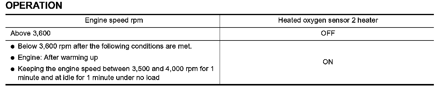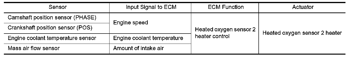 The ECM performs ON/OFF control of the heated oxygen sensor 2 heater corresponding to the engine speed, amount of intake air and engine coolant temperature.