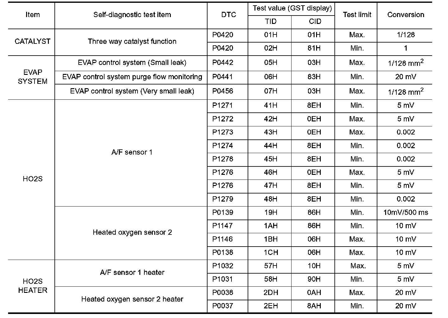 The test value is a parameter used to determine whether a system/circuit diagnostic test is "OK" or "NG" while being monitored by the ECM during self-diagnosis. The test limit is a reference value which is specified as the maximum or minimum value and is compared with the test value being monitored.