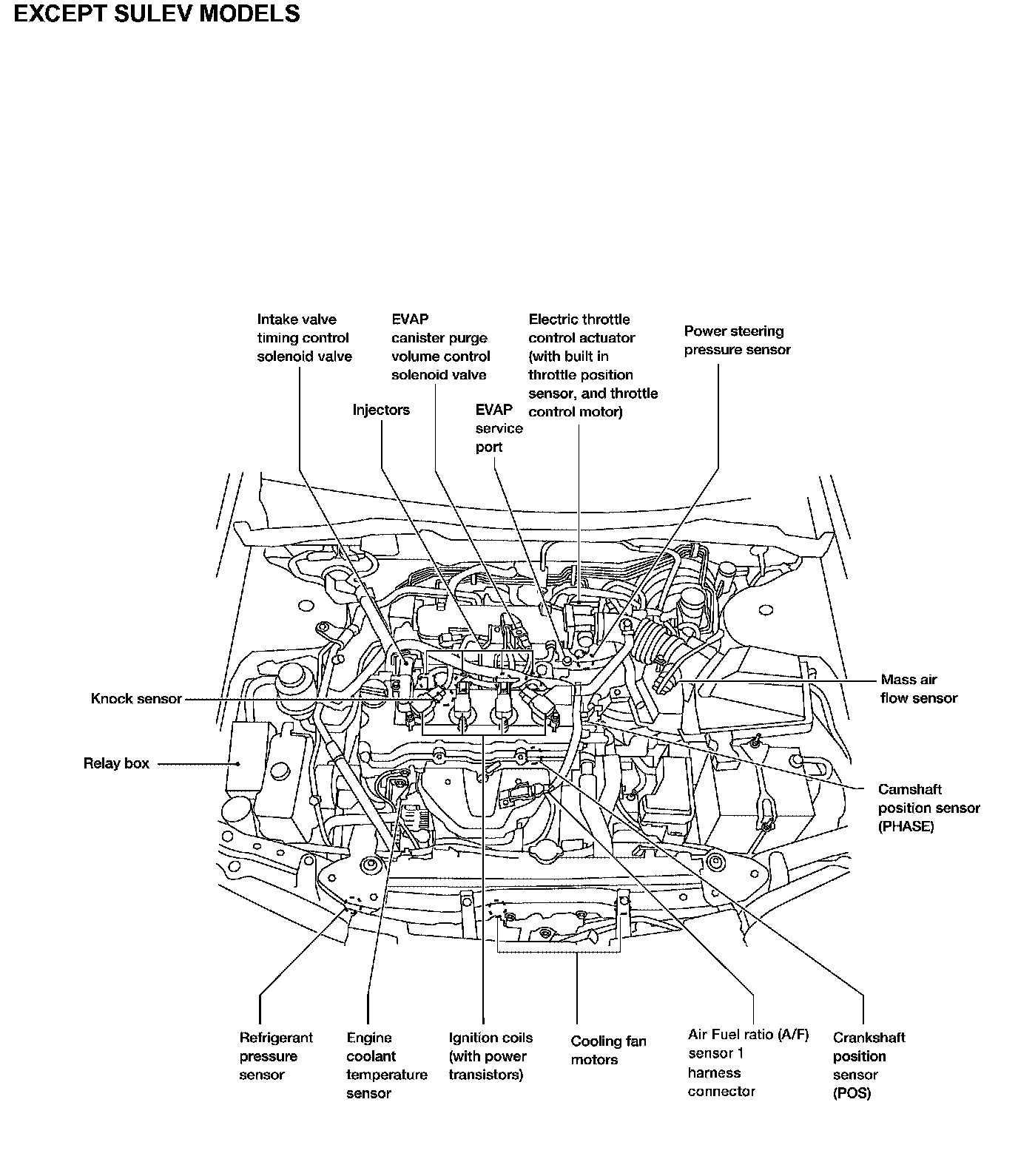 Engine Control Component Parts Location (Except SULEV Models):