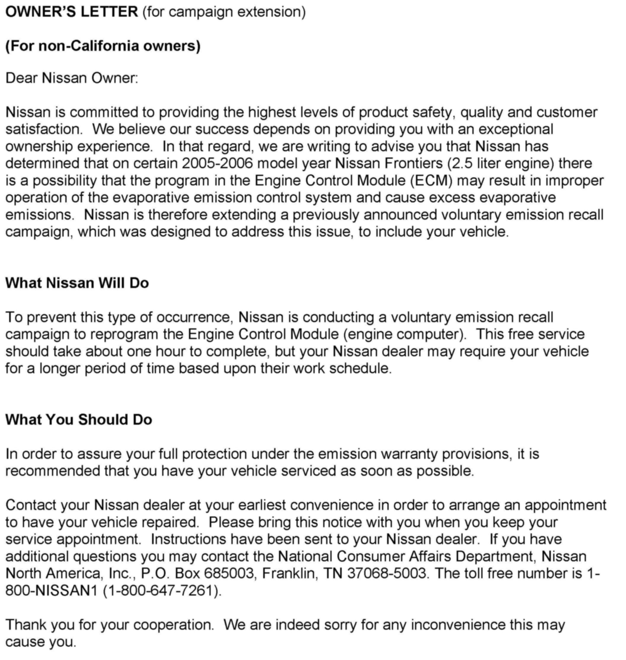 Owner Letter - For Non-California Owners