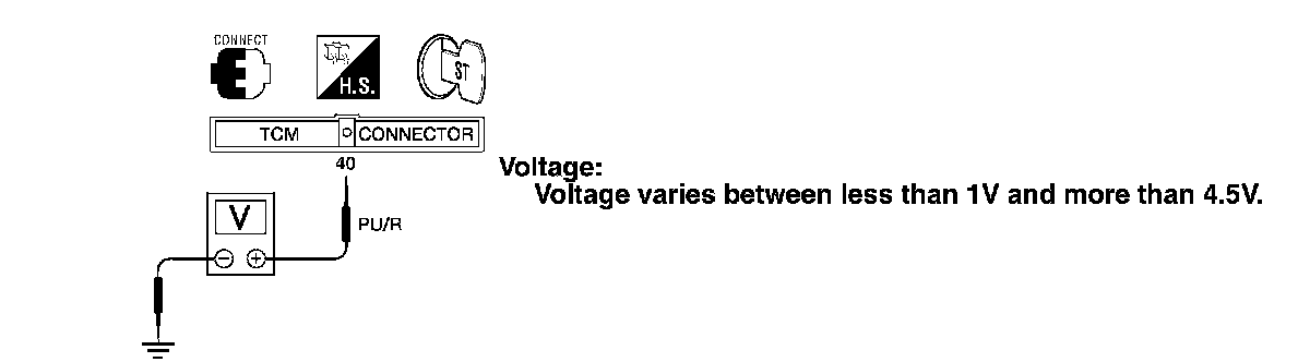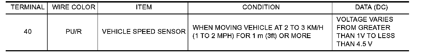 2. Check voltage between TCM terminal 40 and ground while driving at 2 to 3 km/h (1 to 2 MPH) for 1 m (3 ft) or more.