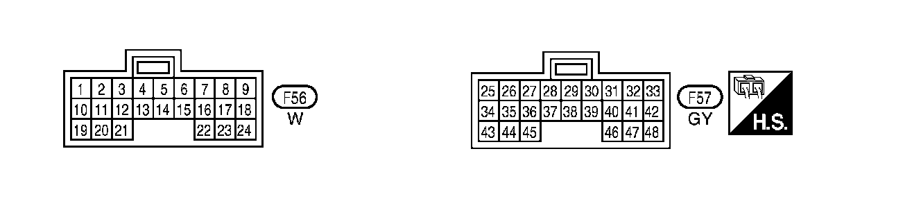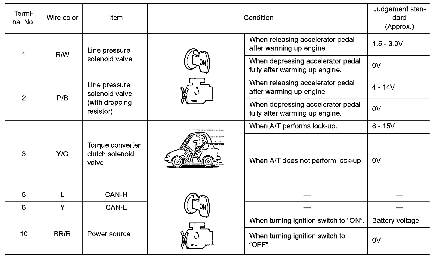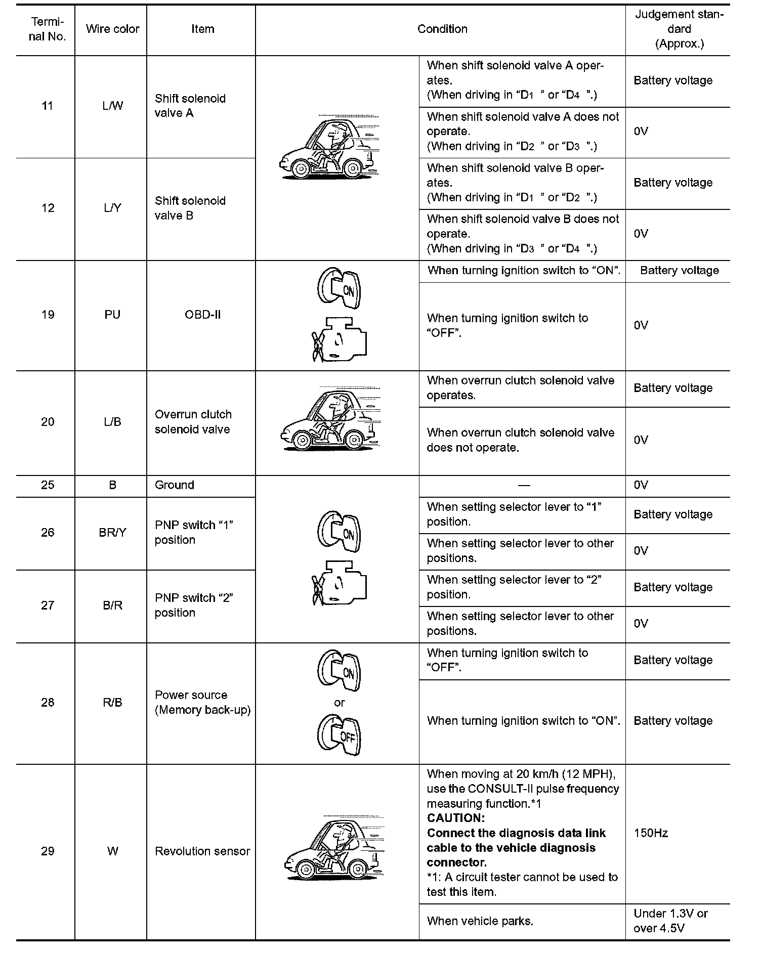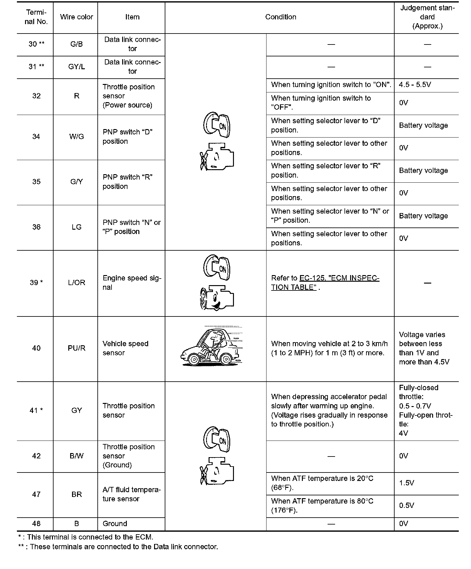 ^ Measure voltage between each terminal and terminal 25 or 48 by following TCM INSPECTION TABLE.