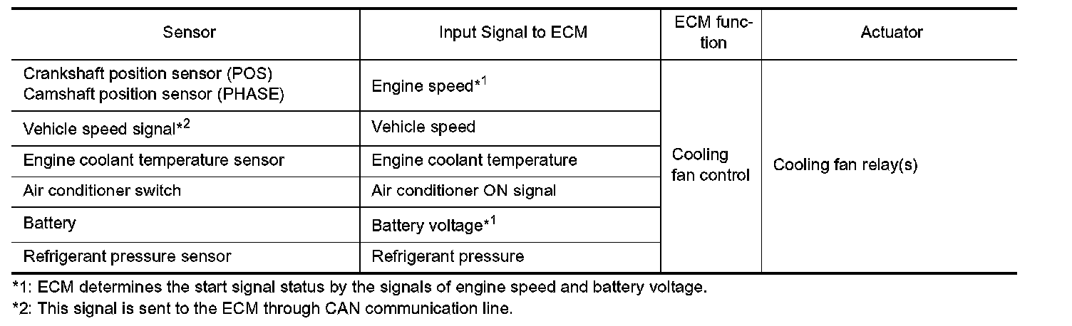 The ECM controls the cooling fan corresponding to the vehicle speed, engine coolant temperature, refrigerant pressure, and air conditioner ON signal. The control system has 3-step control [HIGH/LOW/OFF].