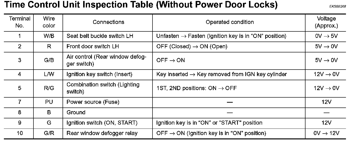 Time Control Unit Inspection Table (Without Power Door Locks):
