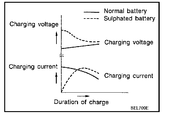 To determine if a battery has been "sulphated", note its voltage and current when charging it. As shown in the figure, less current and higher voltage are observed in the initial stage of charging sulphated batteries.