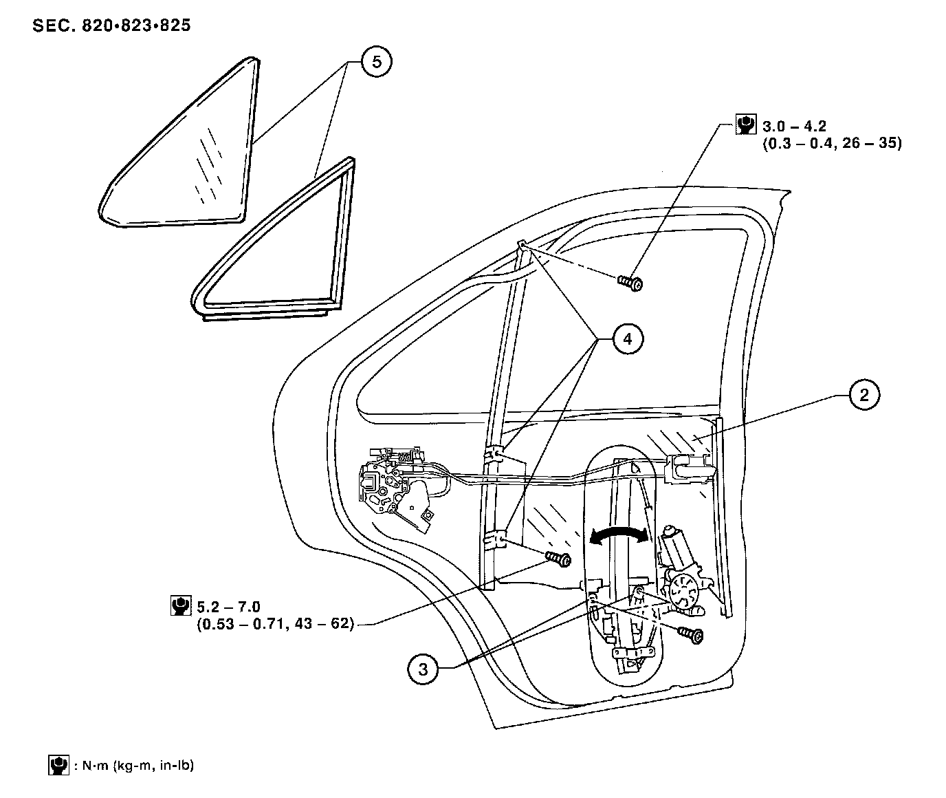 4. Remove two bolts and one top screw securing rear door center sash, then remove rear door center sash.